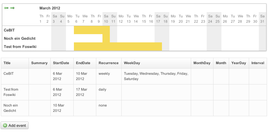 Below screenshot 3 shows an integration with Foswiki:Extensions/HolidaylistPlugin and Foswiki:Extensions/ICalPlugin
