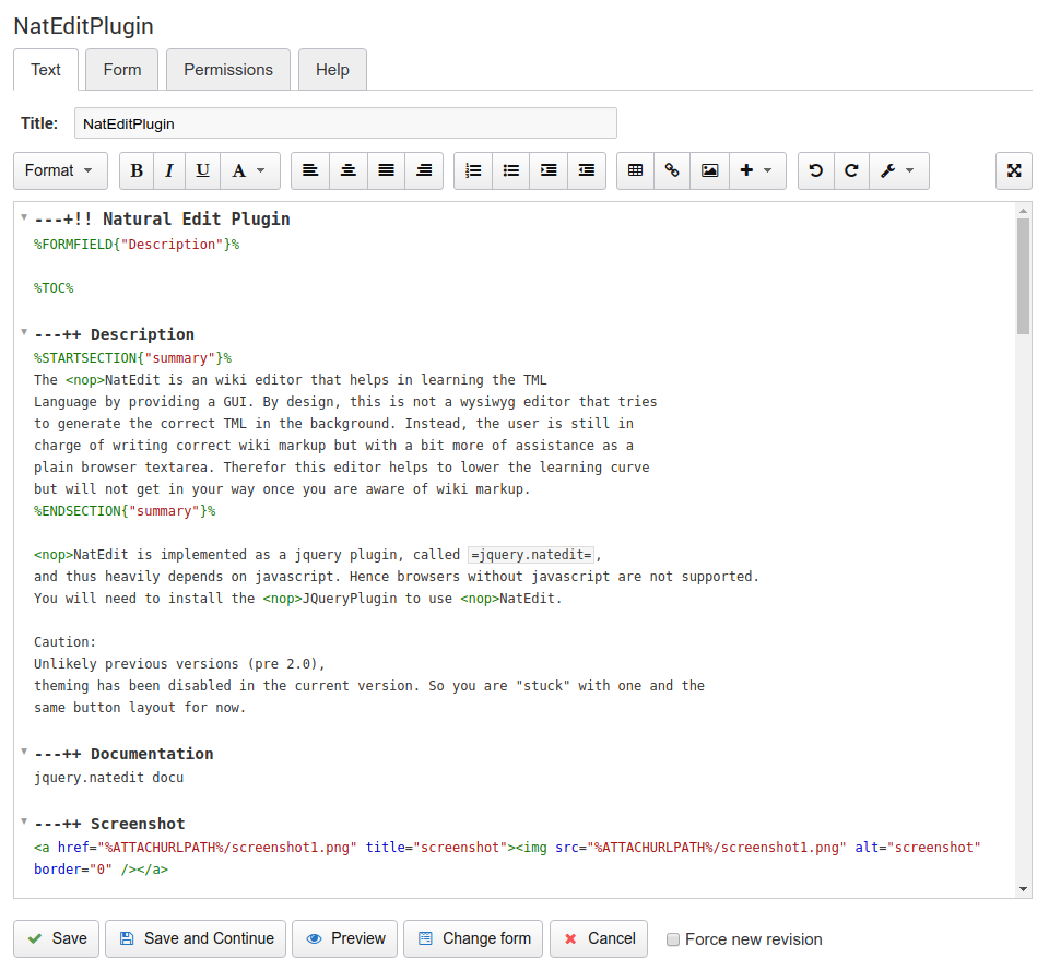 | 07 Jan 2009 | support for TinyMCEPlugin wysiwyg editor; removed non-maintained "word" style; fixes for foswiki/compat; added settings template; distinguishing restore revision from a normal edit; made DBCachePlugin's topic title feature optional; added "Show on screen" settings to easily switch off form, attachment or meta:comments (forthcoming); fixed action=text; removing TopicTitle formfield from the "Form" tab if it is already on the "Text" tab |