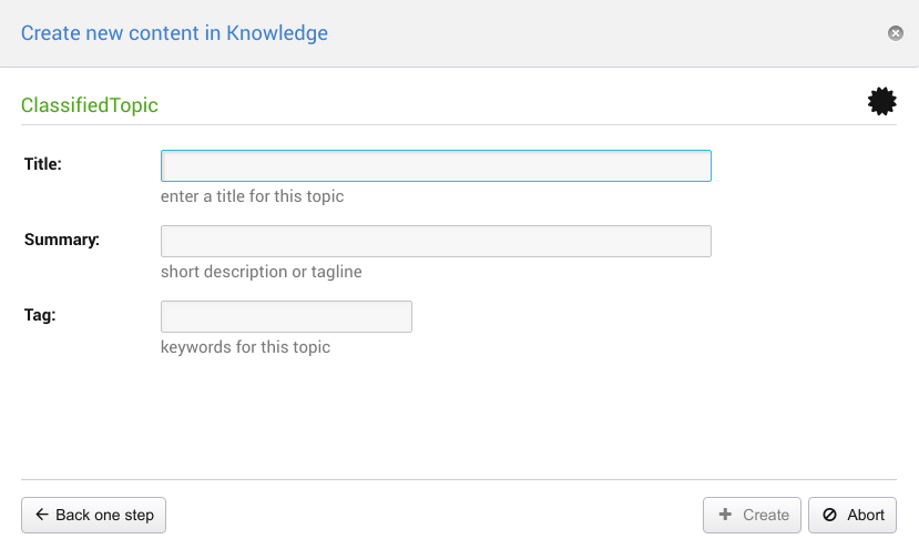 In above example "Classified Topic" has been selected in the first step. Now there are 3 additional TopicTemplates available for this TopicType: "ArticleTemplate", "Bookmark" and "SprintBoardTemplate" which will
