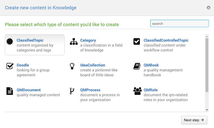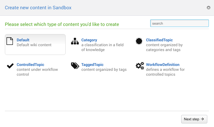 Once you selected the type of content to be created there is an optional second step to select the TopicTemplate available in the current web tailored towards the selected TopicType. This step will be skipped
