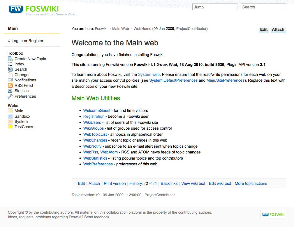 • Topic System.WebBottomBar defines the content of the bottom bar. If this topic does not exist the topic System.WebBottomBarExample will define the bottom bar. Foswiki does not ship with a WebBottomBar topic so by creating this topic as a copy of WebBottomBarExample and customizing the copy, you will not later risk that upgrading Foswiki will overwrite your bottom bar. The bottom bar is common for all webs.